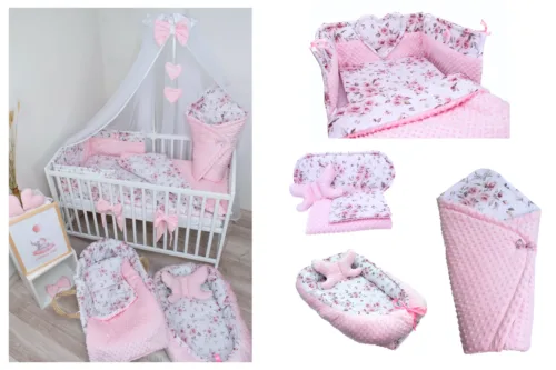 Zestaw do łóżeczka z ochraniaczem z sercem miki główki malina z malinowym minky