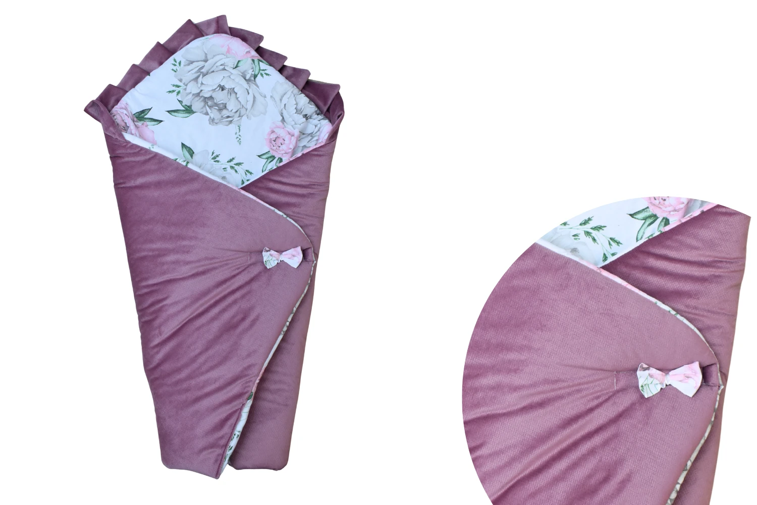 Nasze rożki są zapinane na rzep oraz wykonane ze sztywniejszej watoliny antyalergicznej która zapewnia bezpieczne i komfortowe utrzymanie niemowlęcia. Posiadają również piękną ozdobną falbankę.