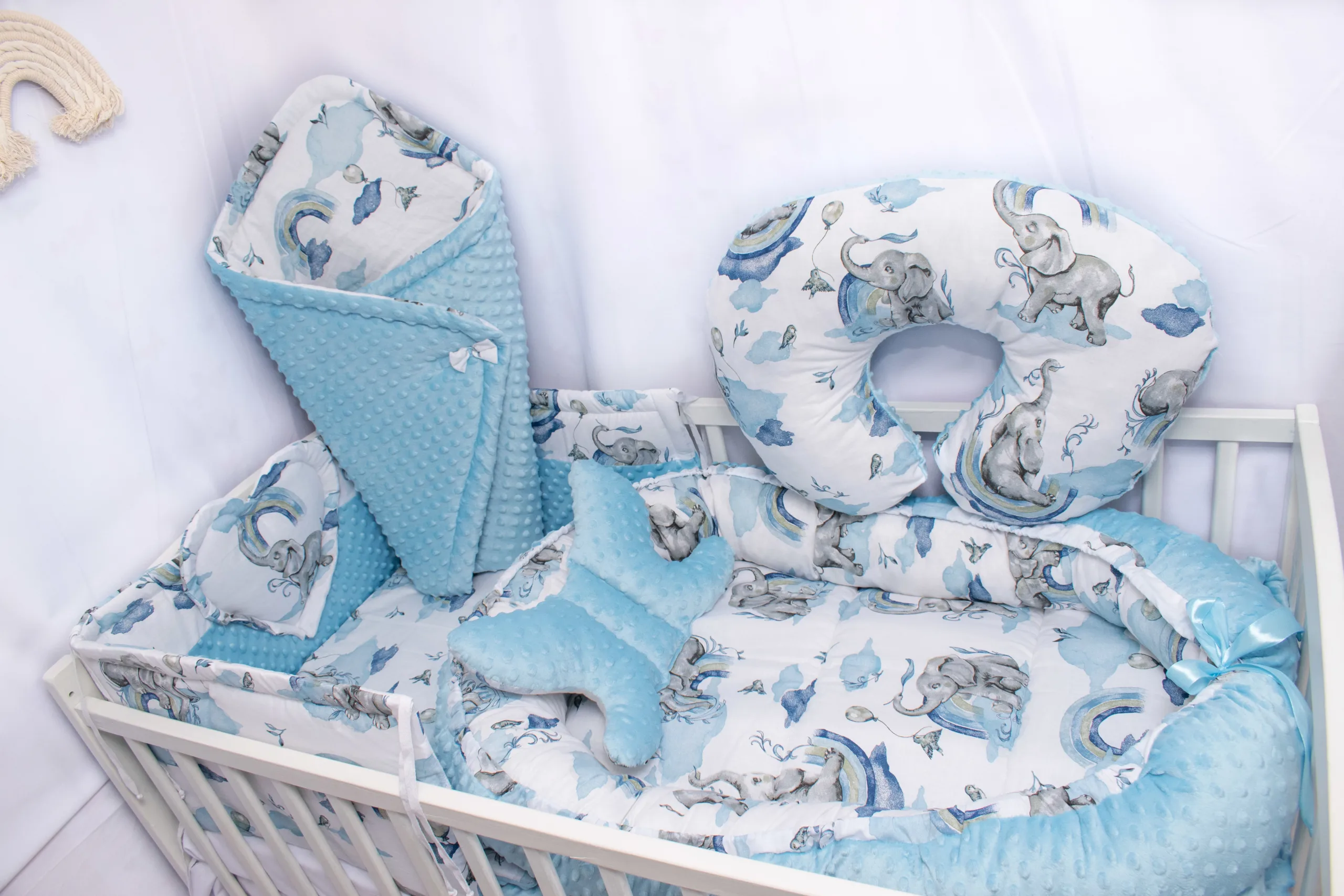 Śliczny 8-elementowy komplet do łóżeczka słonik z błękitnym minky z ochraniaczem z sercem, prześcieradłem, kokonem, rożkiem oraz poduszką rogal.
