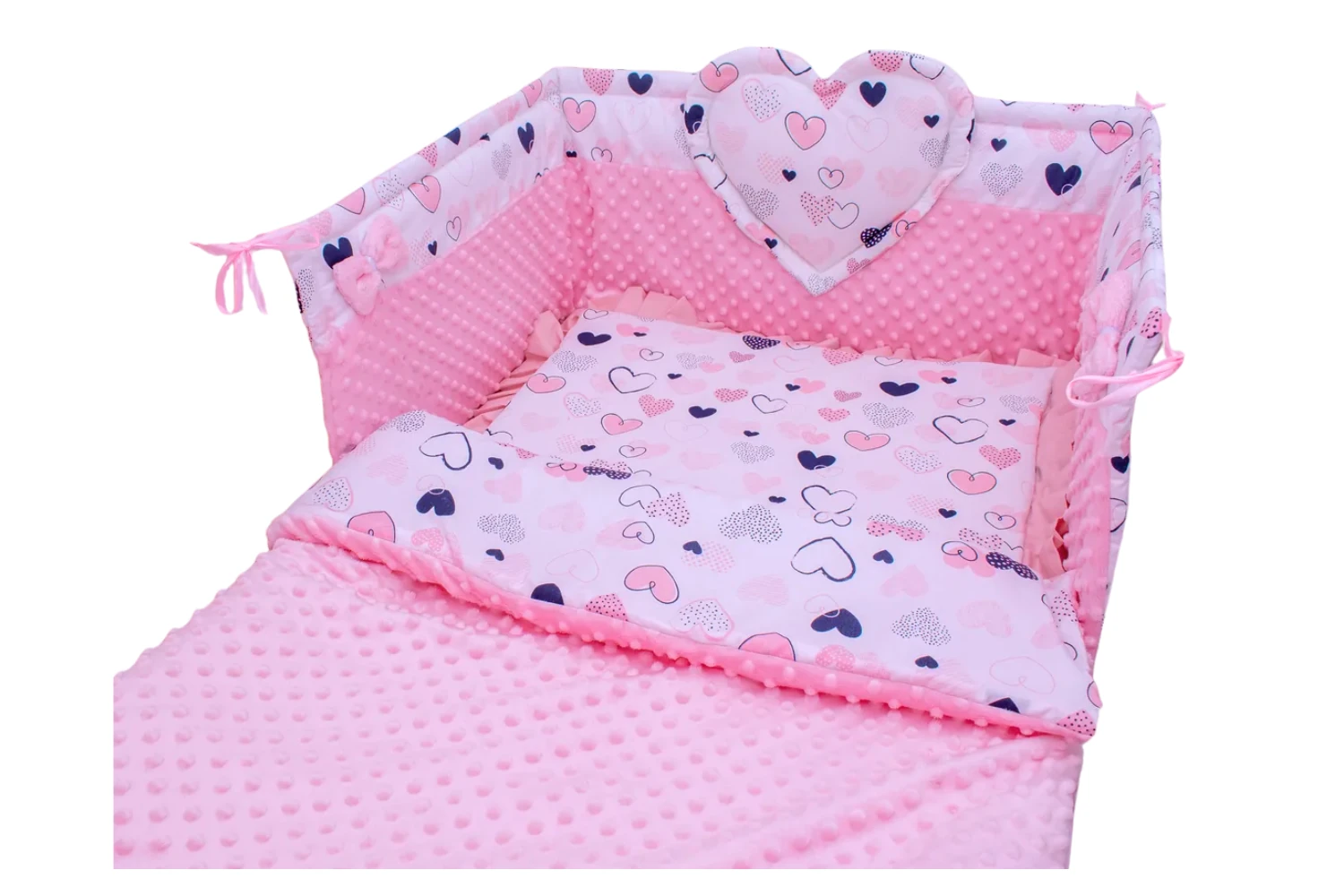 Zestaw do łóżeczka z ochraniaczem z sercem z ozdobną falbanką to praktyczny i funkcjonalny zestaw, który zapewnia dziecku bezpieczeństwo i komfort. Ochraniacz na łóżeczko pokrywa krawędzie łóżeczka, zapobiegając uderzeniom i kontuzjom, gdy dziecko porusza się podczas snu.